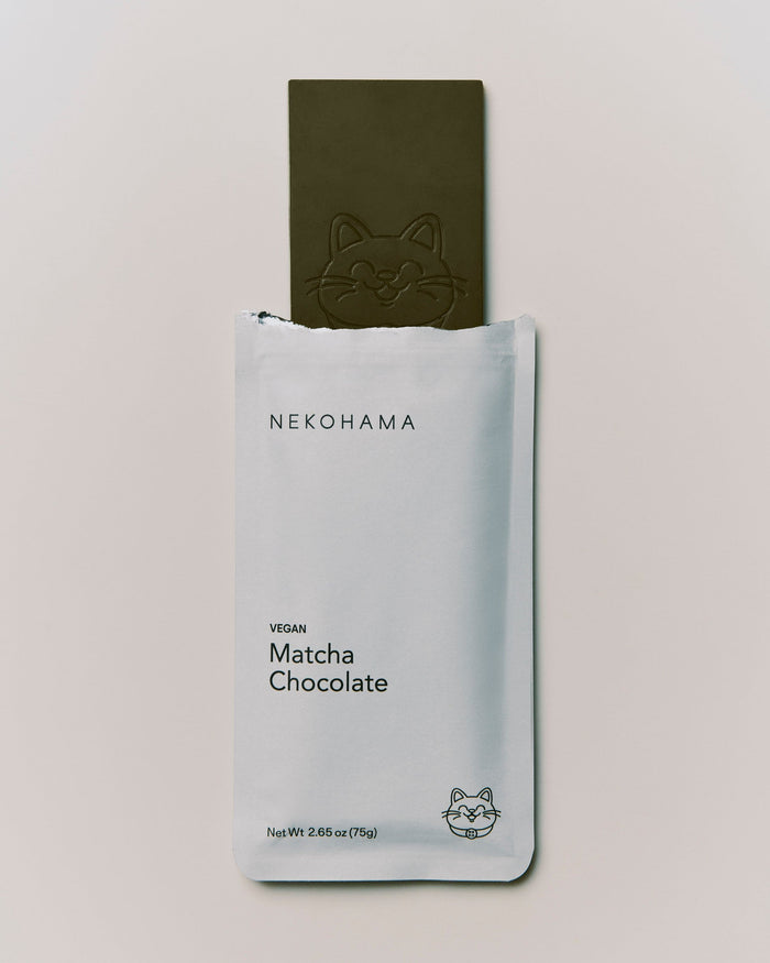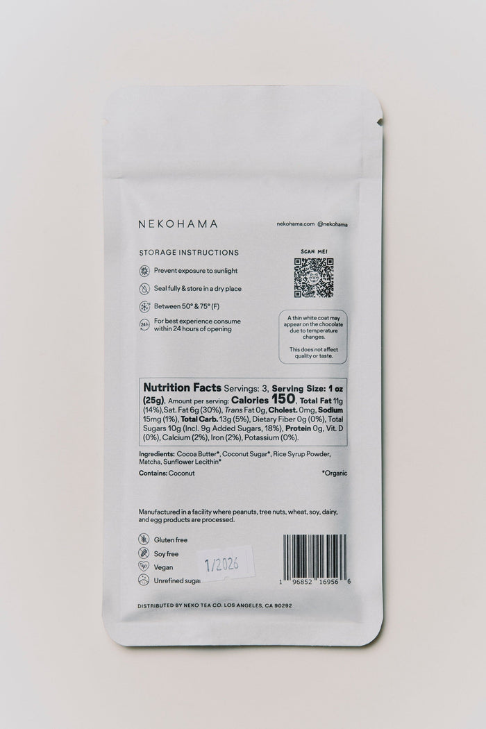 Allergen Note:Manufactured in facilities that also process: dairy, wheat, peanuts, soy, almond, cashew, walnut, pecan, and coconut.Bring a touch of indulgence to your ritual with our Vegan Matcha Chocolate Bar—a truly unique way to savor the richness of Nekohama matcha.